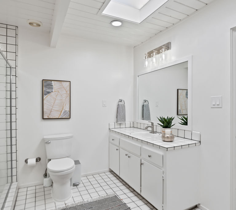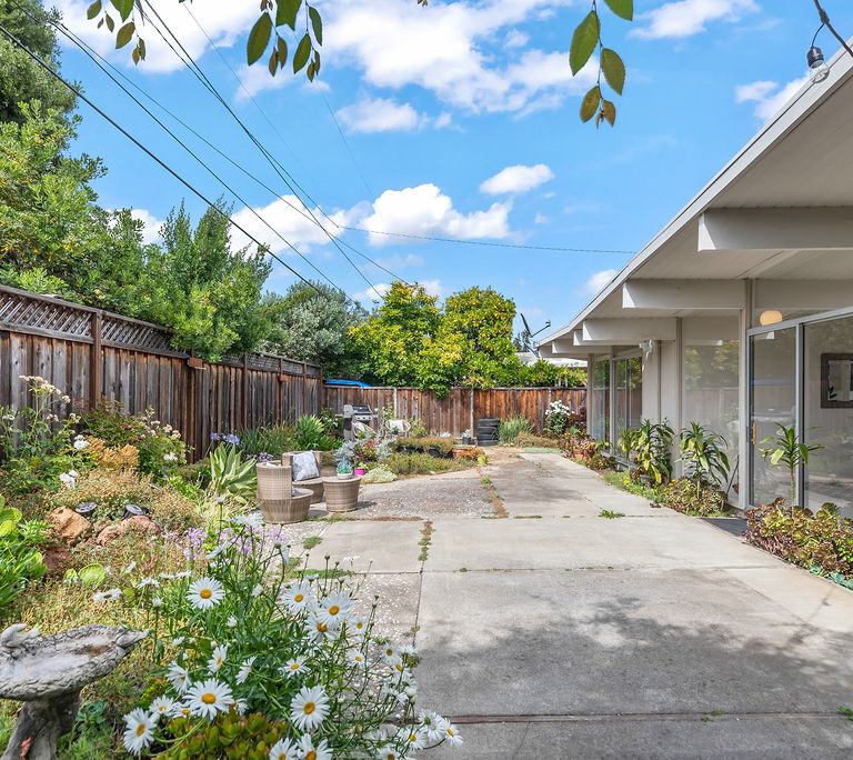 Exciting features include classic Eichler details such as all back-facing rooms having remarkable floor-to-ceiling glass walls overlooking the backyard with stunning flowers, multiple seating areas, and mature trees. Additional attributes include owned Sunpower solar panels, large skylights, newer radiant heating and water heater, and more!