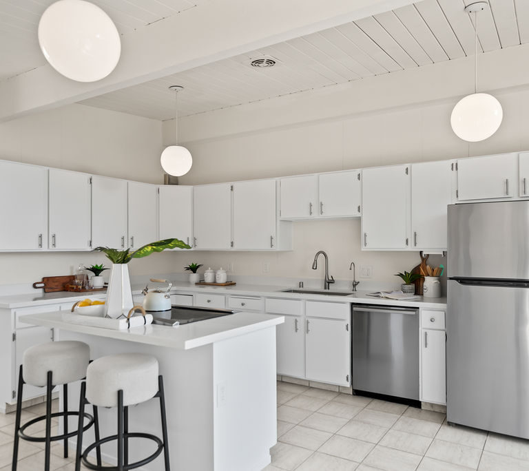 Prepare meals in the modern white kitchen with stainless steel appliances, attractive quartz counters, fresh white cabinets, ample storage, and island with cooktop and seating.